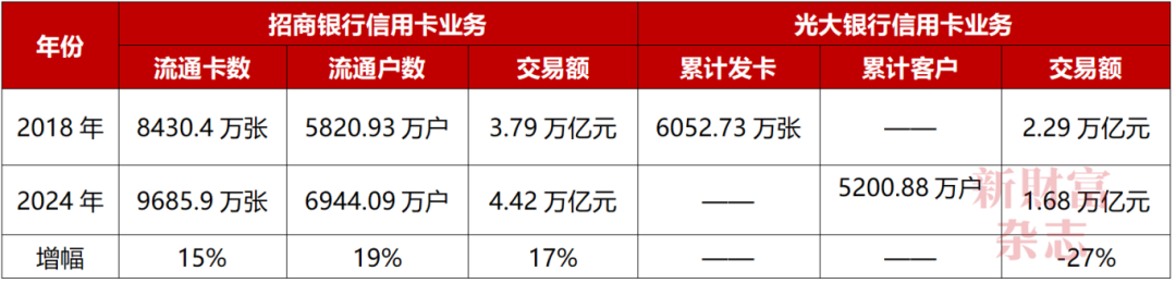 2018至2024年间,招行信用卡无论是从流通卡数、户数还是交易额,均实现了15%以上的增长,而同期光大银行的信用卡交易额则从2.29万亿元下降到1.68万亿元,降幅达27%(表6)。