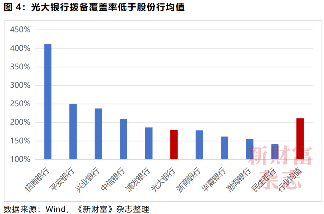 2024年末,光大银行的拨备覆盖率(指银行计提的贷款损失准备与不良贷款余额之间的比率)为180.59%,同期,10家上市股份行的拨备覆盖率均值为211.5%,如招行的拨备率达到了411.98%,平安银行达到250.71%,后两者的账面上更为充分计提了不良贷款可能带来的损失,为预期损失打造了更厚实的“缓冲垫”(图4)。