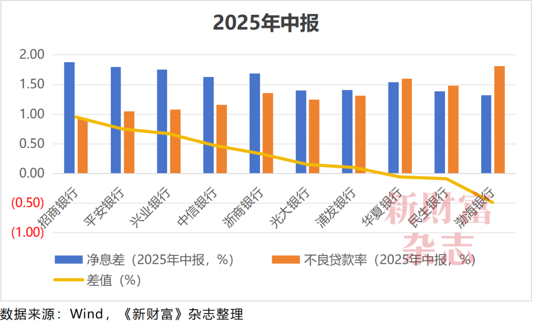 对于贷款业务来说,净息差决定了其账面盈利,而不良贷款率则是其不得不承担的风险成本,它反映了贷款资产中可能无法收回的部分所占的比例。净息差扣掉不良贷款率,才反映银行贷款业务经过风险调整后的真实盈利能力。