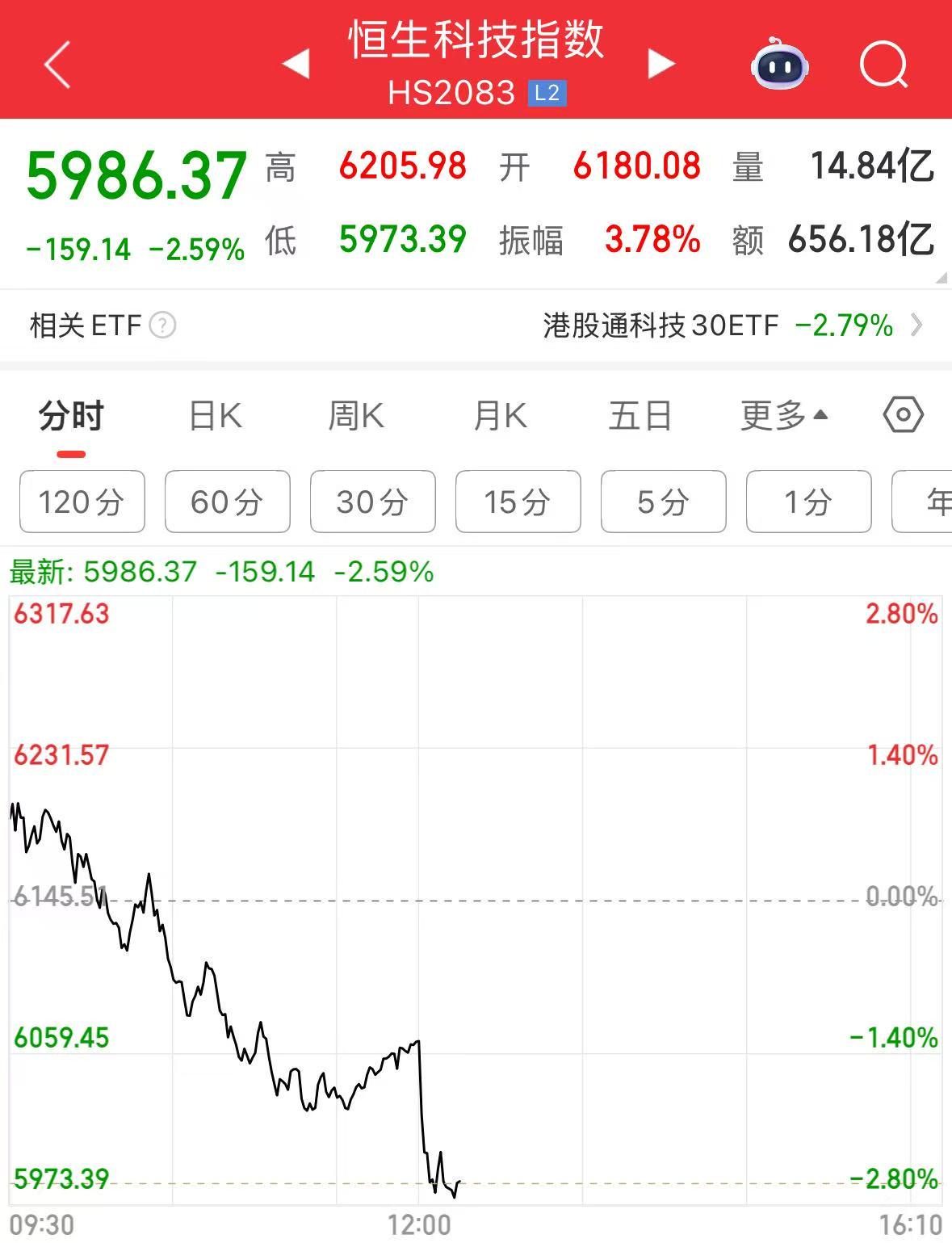 【恒生科技指数午后跌幅扩大至2%】14日午后,恒生科技指数跌幅扩大至2%。截至发稿,恒生科技指数跌2.59%,报5986.37点。华虹半导体跌超11%、中芯国际跌超6%。(中新经纬APP)