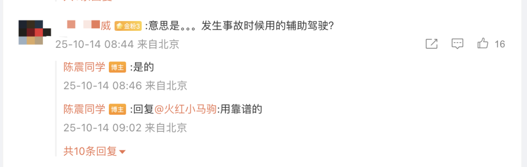 10月14日,陈震再回应:“虽然都叫辅助驾驶,但不同品牌的辅助驾驶之间,区别可大了去了。另外,在现行法规下,驾驶人不论在什么情况下都是第一责任人!比如我这次。”