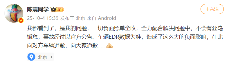 同日,陈震就“劳斯莱斯车祸”一事发文致歉:“我都看到了,是我的问题,一切负面照单全收,全力配合解决问题中,不会有丝毫懈怠,事故经过以官方公告、车辆EDR数据为准,造成了这么大的负面影响,在此向对方车辆道歉,向大家道歉。”