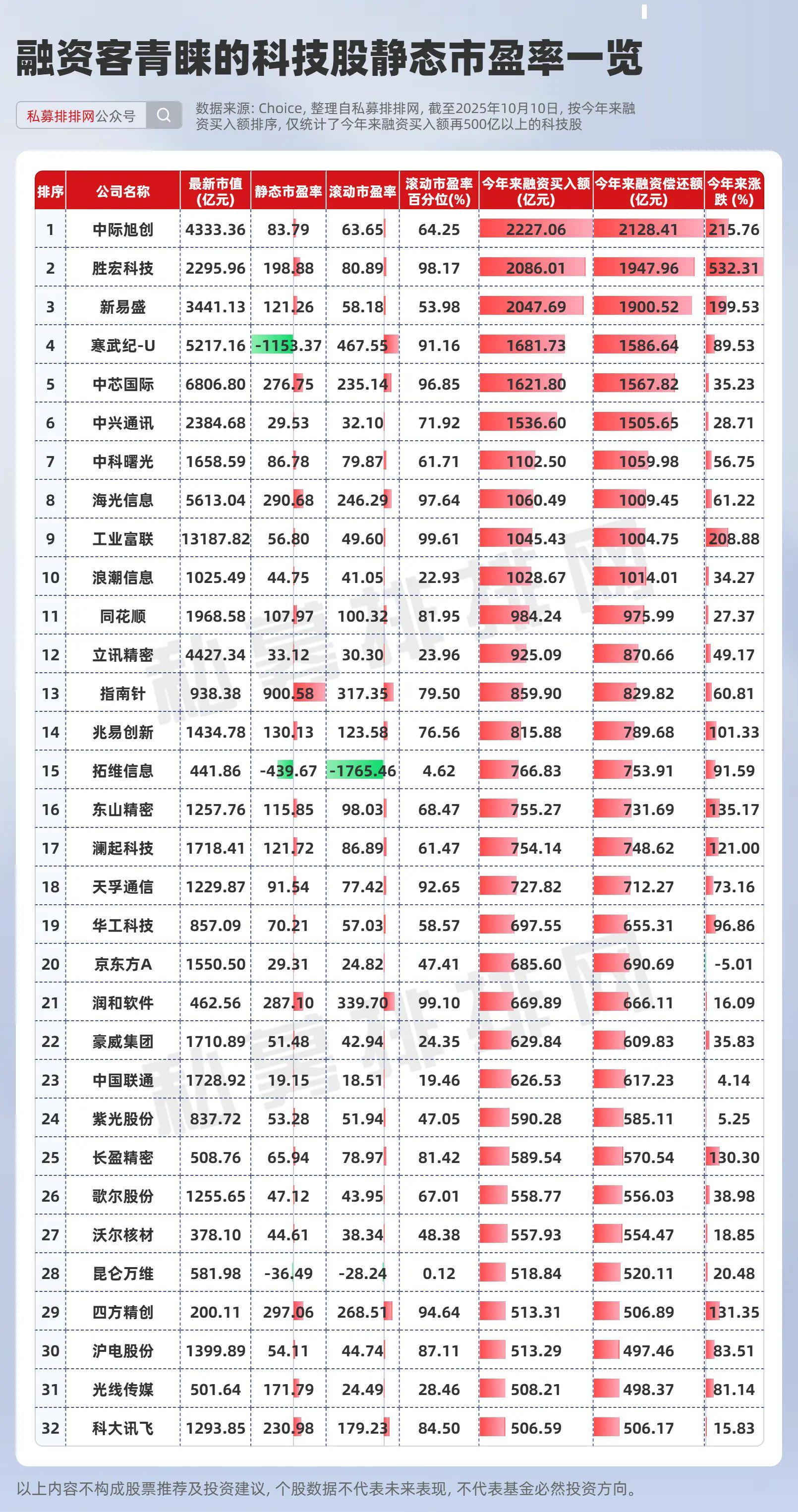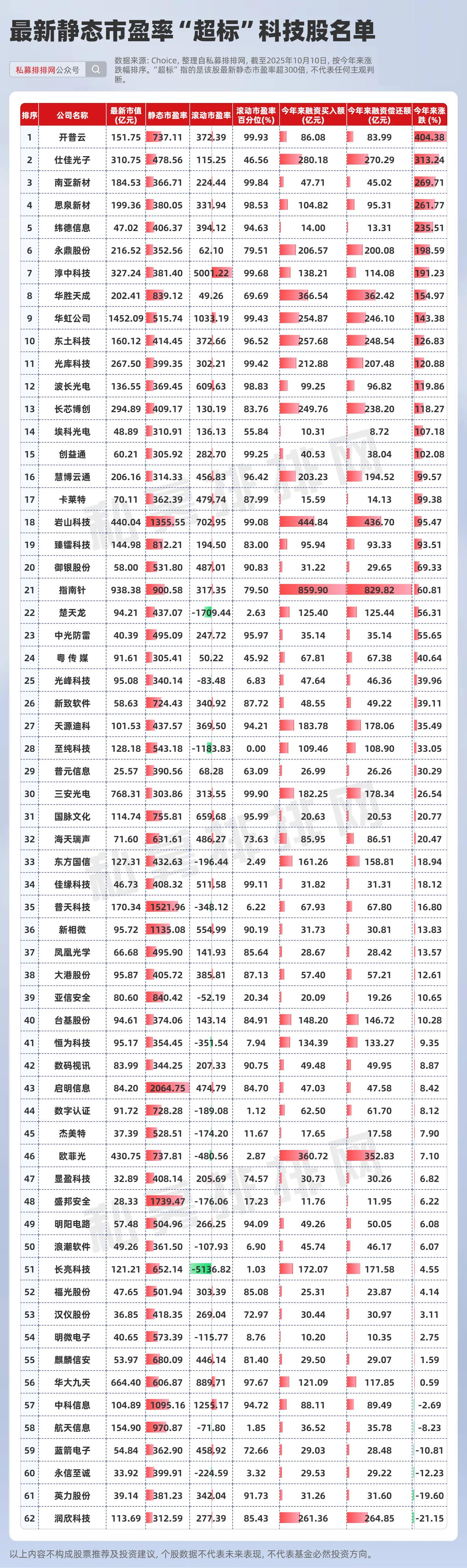 截至10月10日,全A股共有3726只融资融券标中,静态市盈率超300倍或为负数的股票共1638只;因今年来股价涨幅,导致静态市盈率“超标”的个股有273只,其中静态市盈率“超标”的科技股共有62只。包括年内涨幅近两倍的液冷龙头股淳中科技、半导体龙头华虹公司、华胜天成等。