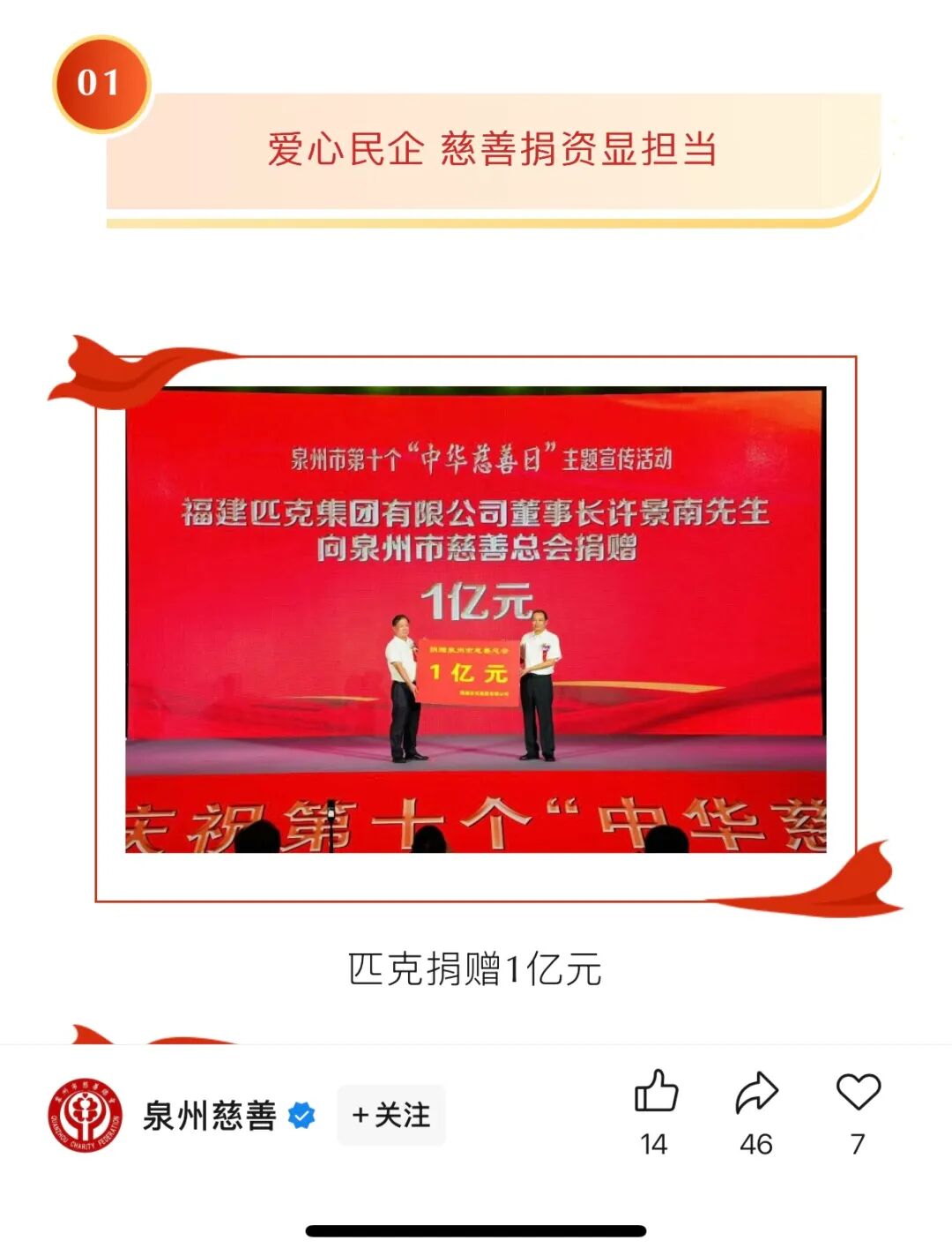 在许景南宣称“今年1-7月亏损1.3亿”的相近时间里,匹克高调向泉州市慈善总会捐了1亿元。许景南站在讲台上举着捐款牌的照片,还被“泉州慈善”官号刊登在新闻中。