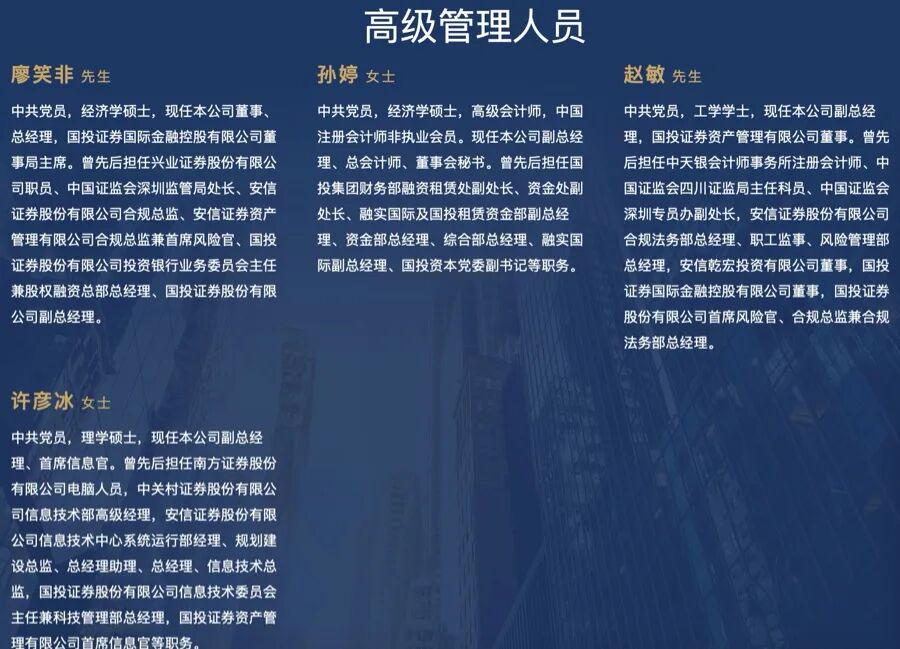 随着廖笑非履新,此前由董事长王苏望 “一肩挑” 的总经理职位正式补位,公司核心管理架构重新落地。目前,国投证券官网已经更新了新任高管信息,共计4名高级管理人员,分别是公司董事、总经理廖笑非,公司副总经理、总会计师、董事会秘书孙婷,公司副总经理、首席风险官、合规总监赵敏和公司副总经理、首席信息官兼信息技术委员会主任许彦冰。