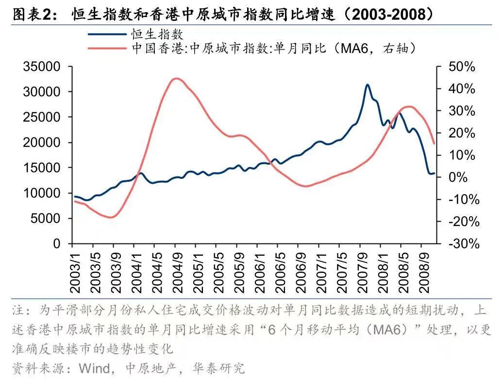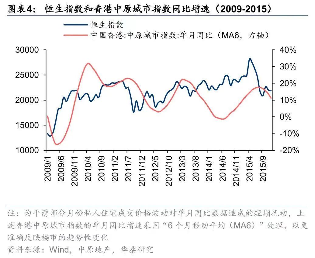 而回顾历史上的指数走势也可发现,香港股市往往对楼市具有领先效应。根据Wind数据,2015年8月至今,代表香港楼市价格的中原城市领先指数大致与恒生指数走势一致,且前者基本滞后数个月。