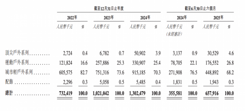 财务数据显示,近年来坦博尔营收持续增长,线上销售收入增长尤其迅速。总营收从2022年的7.32亿元增至2024年的13.02亿元,复合年增长率超过33%。2025年上半年,总营收同比增长85%至6.58亿元。2022年至2025年上半年,城市轻户外系列收入占比始终保持在68.2%至82.7%之间,是公司稳定的业绩压舱石。2022年至2024年,公司线上渠道收入从2.26亿元增至6.26亿元,占比从30.9%提升至48.1%。2025年上半年的线上收入占比首次超过线下。