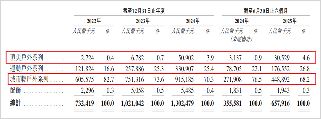 尽管有三大系列产品,但坦博尔收入高度依赖均价300多元的“城市轻户外系列”,该系列在2025年上半年贡献了68.2%的收入,而定价更高的“顶尖户外系列”收入占比仅为4.6%。这种产品结构也使得公司难以建立高端品牌形象,限制了产品的溢价能力。