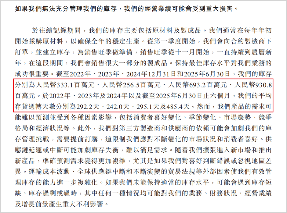 营销开支的持续攀升成为侵蚀公司利润的重要因素。报告期内销售及分销开支从1.99亿元大幅增加至2.61亿元,占收入比重从27.3%一路攀升至39.7%。公司为推进品牌年轻化转型,签约了多位明星代言人并频繁在时尚活动亮相。然而,这种高举高打的营销策略尚未带来相应的利润回报,反而使得存货问题日益突出。