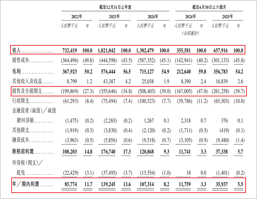 招股书显示,2022年至2025年6月底(以下简称:报告期),公司的营收分别为7.32亿元、10.21亿元、13.02亿元和6.58亿元,整体展现出不错的增长势头。然而,同期公司的净利润却分别只有0.86亿元、1.39亿元、1.07亿元和0.36亿元,净利率从最高的13.6%下滑至5.5%。这也暴露出坦博尔在成本控制方面存在的巨大压力,而这一问题与公司的战略选择和行业竞争态势密切相关。