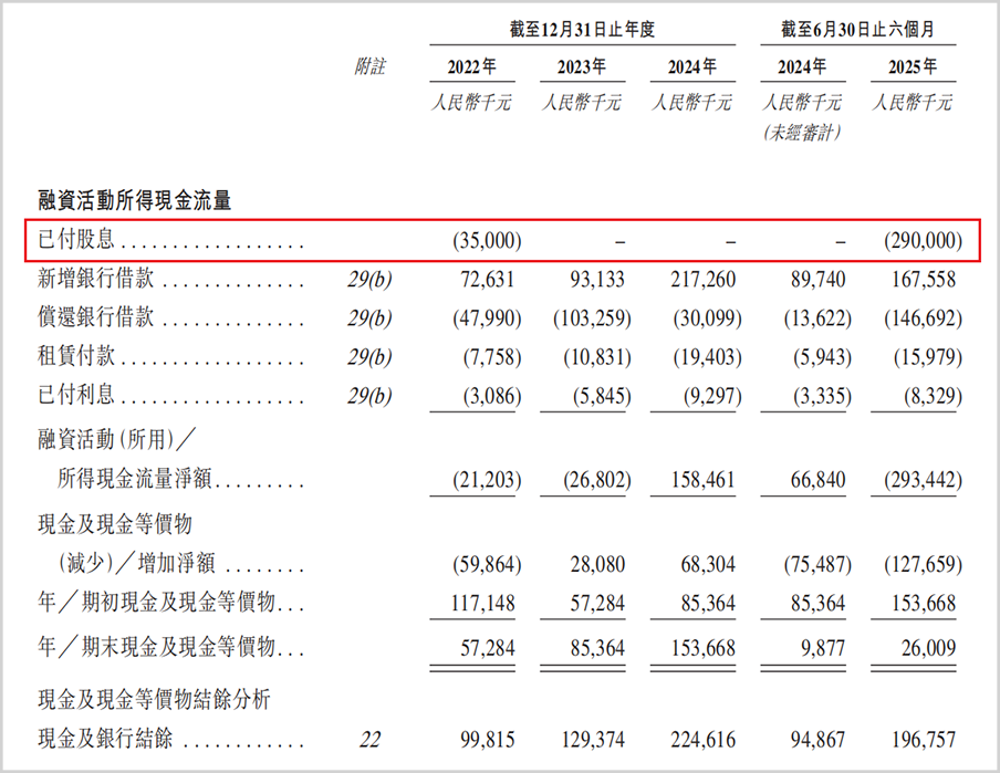 招股书显示,在2025年上半年公司突击分红2.9亿元,是2024年全年净利润的2.7倍,2025年上半年净利润的超8倍,三年半的时间里公司总共盈利3.68亿元,这笔大额分红几乎掏空公司积累。突击分红直接导致公司净资产从2024年末的7.42亿元降至2025年6月末的4.88亿元,现金储备亦大幅减少,从最高点的1.54亿元,降低至最新的0.26亿元,降幅超83%。