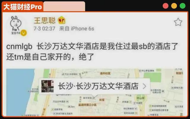 2016年7月,不知是因为泄露他行程,还是服务太差,王思聪凌晨开喷,“长沙万达文华酒店是我住过最sb的酒店了,还tm是自己家开的,绝了”,好像生怕别人不知道,他还特意发了定位。