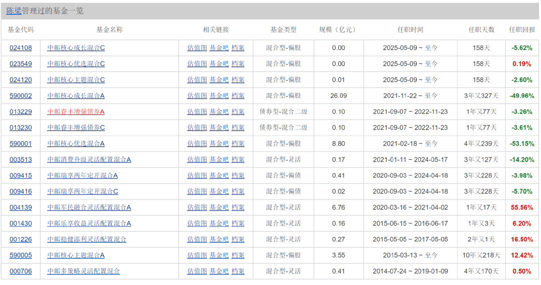 其中最引人注目的当属邓立新。作为任职时间最长的基金经理,曾任中邮基金投资总监的他,最终却因“老鼠仓”问题被调查。颇具讽刺意味的是,在其管理期间,该基金收取的管理费累计超过10亿元,留给投资者的却是长期亏损的巨大窟窿。