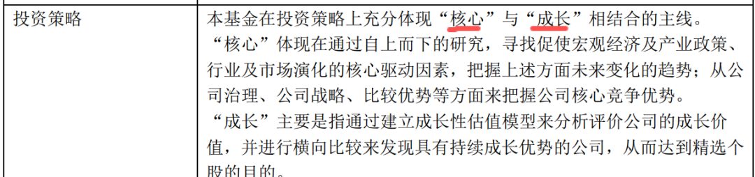 该基金在半年报中写道,本基金在投资策略上充分体现“核心”与“成长”相结合的主线,将重点投资处于成长期的行业,对这些行业给予相对较高估值。