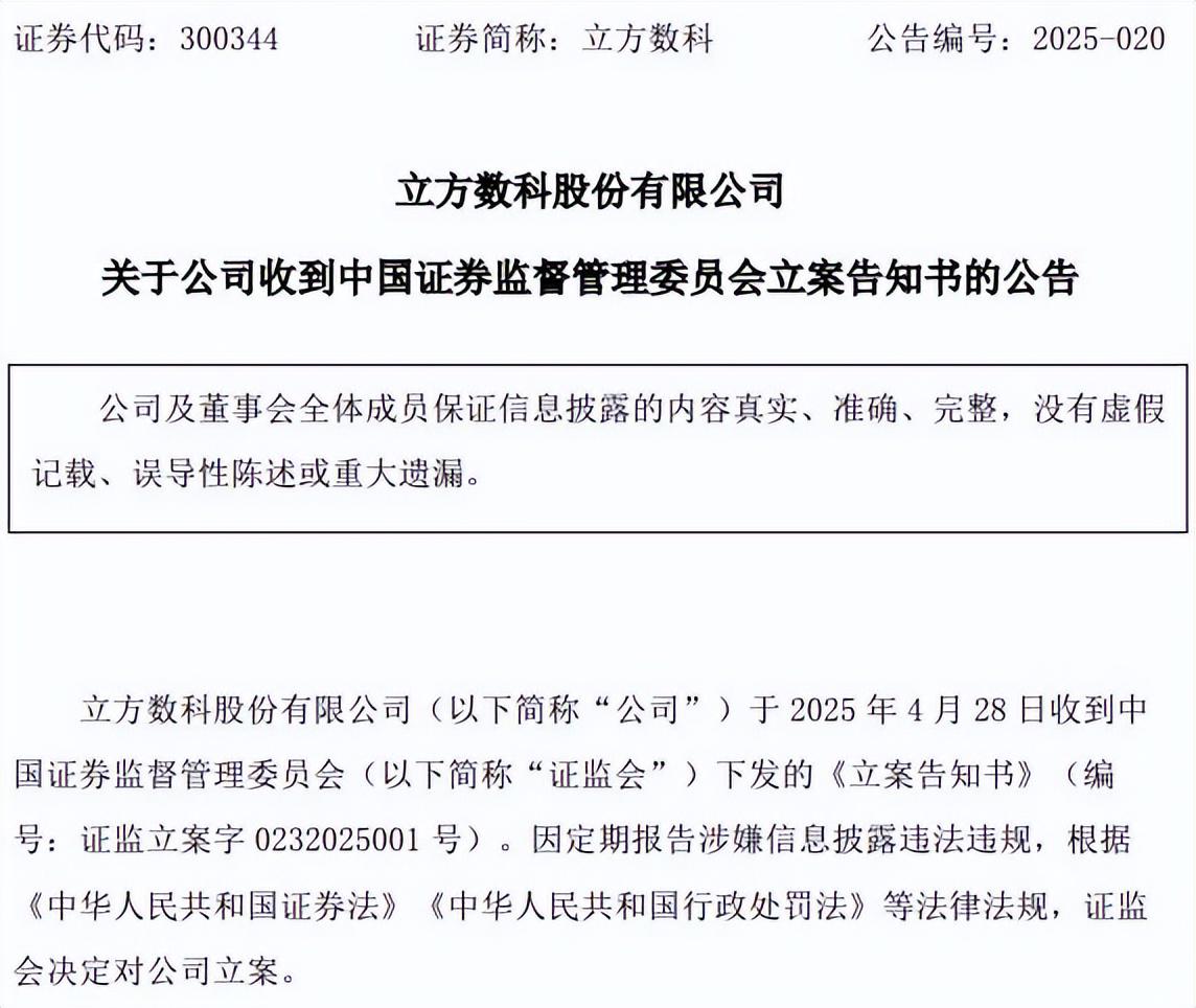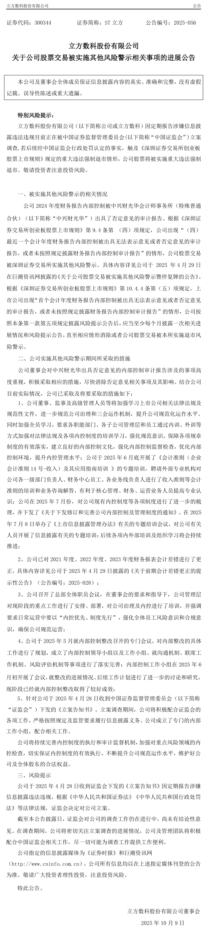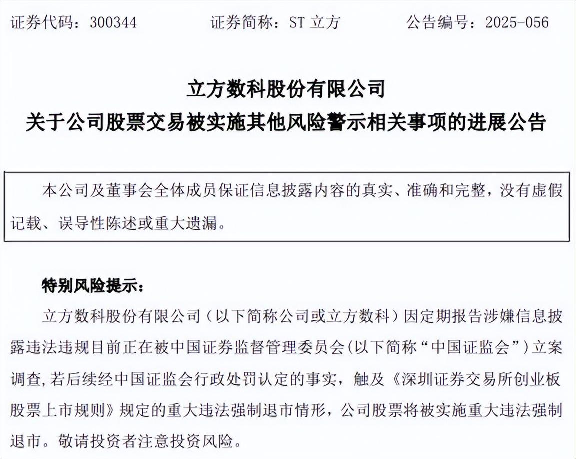2025年10月10日,ST立方发布《关于公司股票交易被实施其他风险警示相关事项的进展公告》。公告称:因公司目前被中国证监会立案调查,若后续公司触及重大违法强制退市情形,其股票将被强制退市,请投资者注意投资风险。