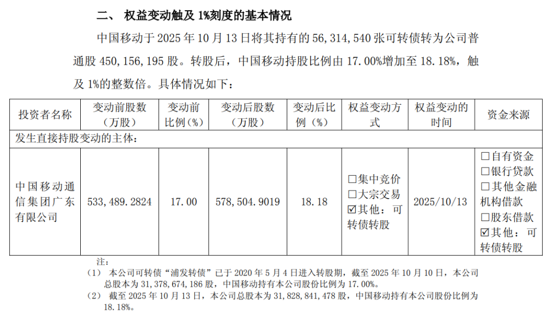 具体情况如下:中国移动于2025年10月13日将其持有的56,314,540张可转债按照每股人民币12.51元的价格,转为浦发银行普通股450,156,195股。转股后,中国移动持股比例由17.00%增加至18.18%。