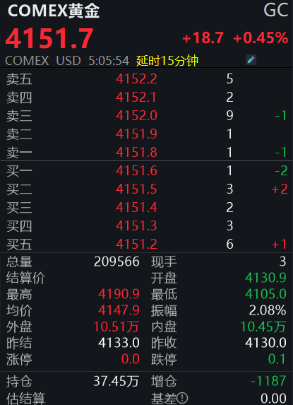 期货方面,COMEX黄金期货也迎来大涨。截至记者发稿,COMEX黄金期货日内大涨0.45%,报4151.7美元/盎司,盘中一度触及4190.9美元/盎司,距离4200美元/盎司大关仅一步之遥,亦创下历史新高。