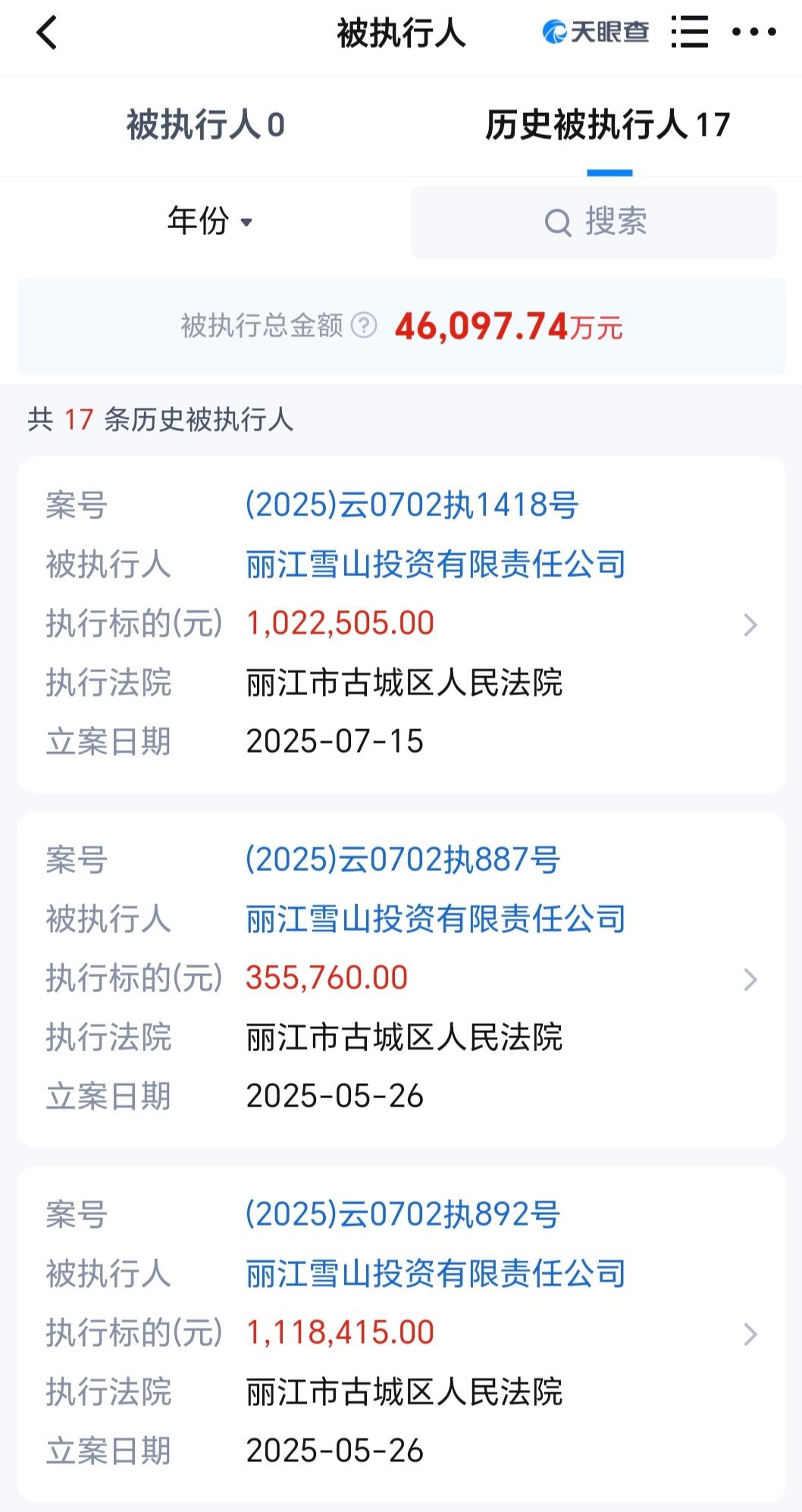 丽江雪山投资有限责任公司被执行总金额超4.6亿
