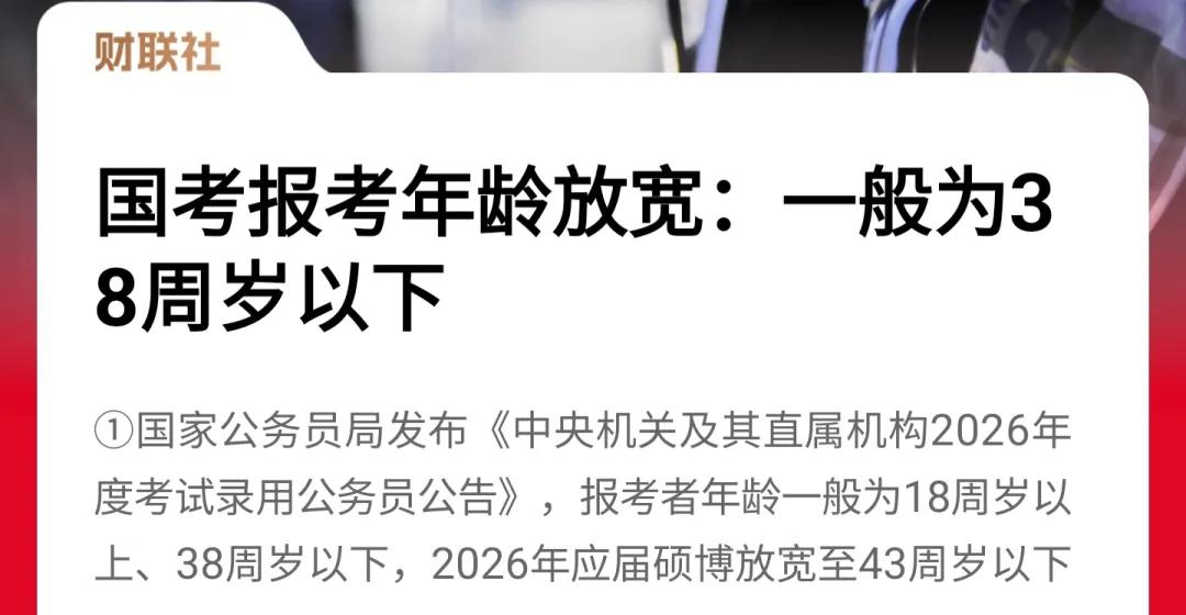 最近,国家公务员局发布公告,2026年国家公务员招录年龄上限从35岁放宽到38岁,应届硕士、博士生放宽到43岁。