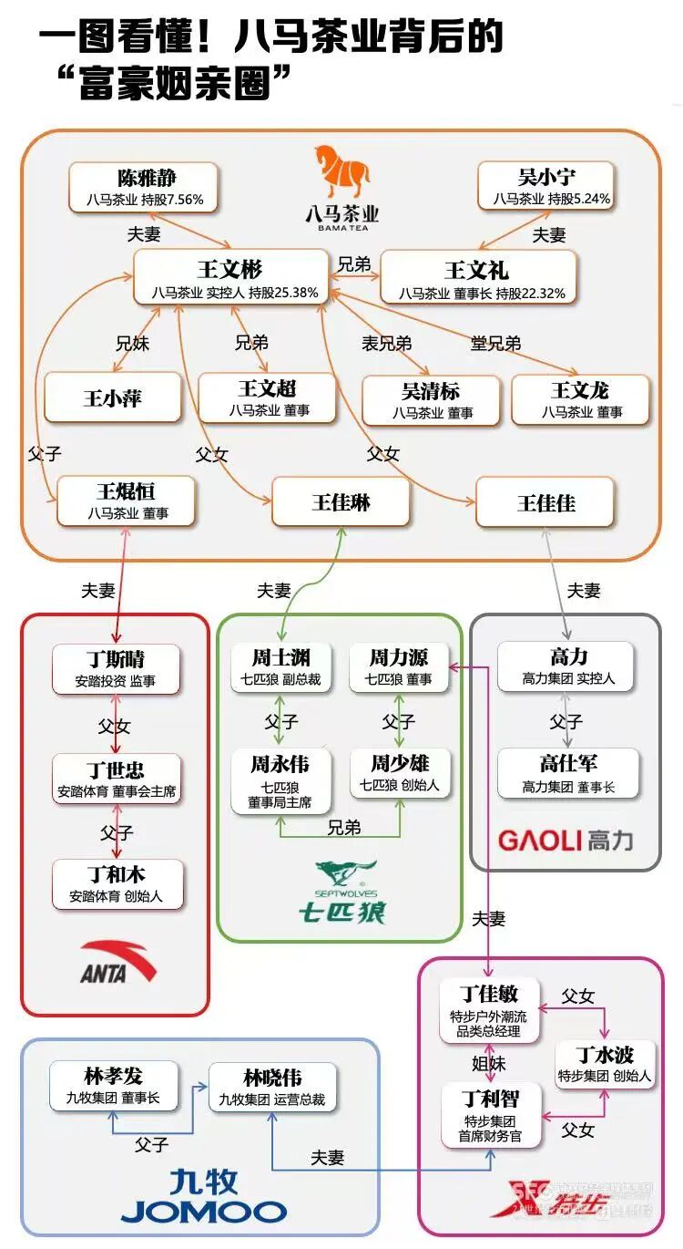 根据招股书公开信息,王文彬之女王佳琳嫁与七匹狼实控人周永伟之子周士渊,七匹狼通过泉州百应持有八马茶业股份;王文彬之子王琨恒娶安踏体育创始人丁世忠之女,安踏系企业与八马茶业存在茶叶采购、场地租赁等关联交易;另一女王佳佳则与江苏高力控股集团继承人联姻,该集团虽未直接持股,但也通过供应链合作与八马茶业“绑定”。