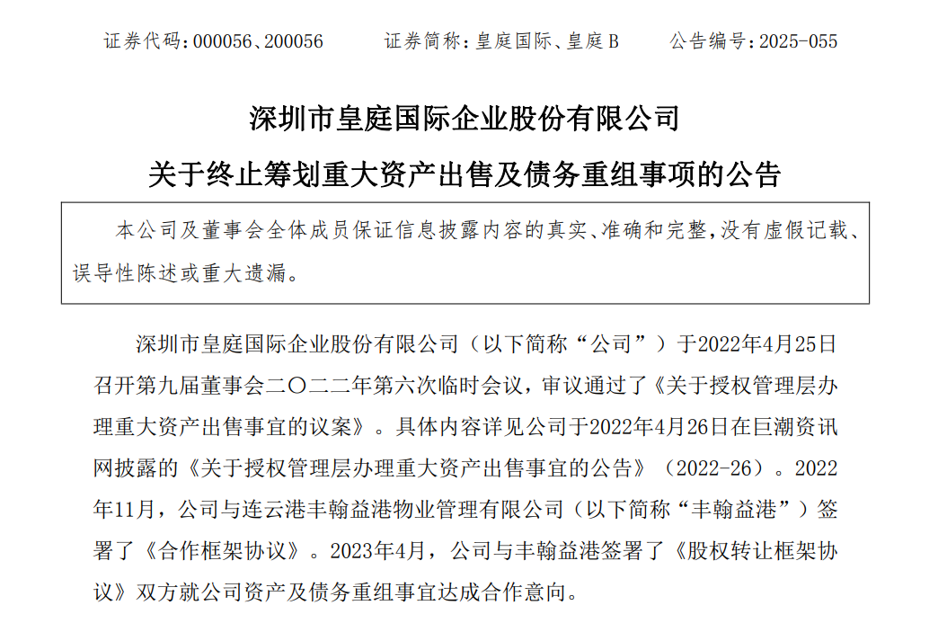 公告显示,2022年起,皇庭国际开始筹划挂牌出售子公司股权并与市场意向方沟通相关资产标的出售及债务重组事项,交易预计构成《上市公司重大资产重组管理办法》规定的重大资产重组情形。