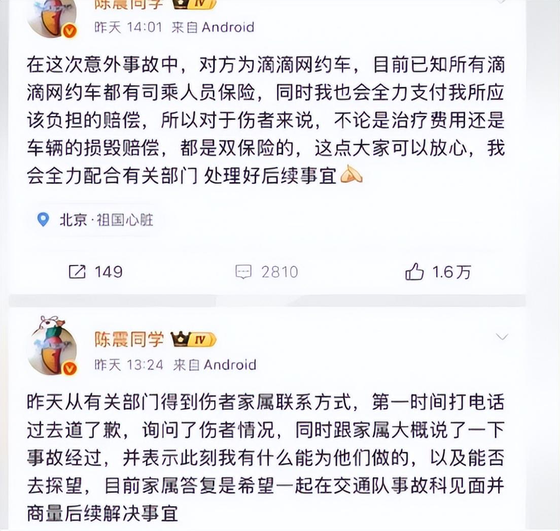 陈震曾回应称,“驾驶人无论在什么情况下都是第一责任人,比如我这次”。当事故中受损的比亚迪司机家属在网上称,“往后的日子会非常难”,希望可以“扛过去”。陈震转发该帖文并再次道歉,称其将会全力配合有关部门,做好后续工作以及补偿给对方所造成的损失。