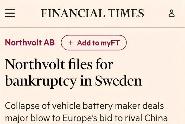 Northvolt破产的相关报道,该集团曾被欧洲各国注资150亿美元救市