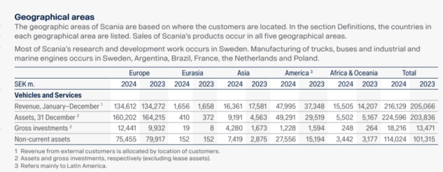 2024年斯堪尼亚分区销售额、投资额、资产额信息 单位:百万瑞典克朗