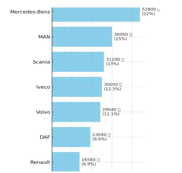 2024年全欧重卡销量排行榜及市场份额,来源:ICCT国际清洁交通委员会