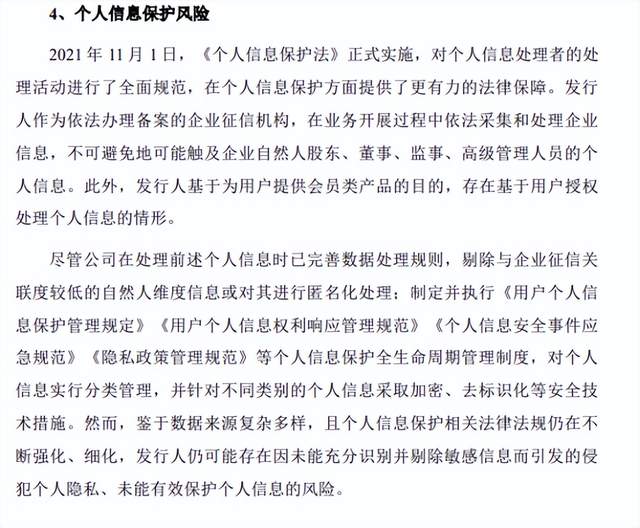 同时,在个人信息保护方面,尽管其在处理相关个人信息时已采取多种措施,但“鉴于数据来源复杂多样,且个人信息保护相关法律法规仍在不断强化、细化,其仍可能存在因未能充分识别并剔除敏感信息而引发的侵犯个人隐私、未能有效保护个人信息的风险。”