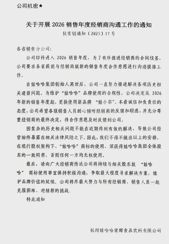 9月中旬,一份《关于开展2026销售年度经销商沟通工作的通知》在业内流出。文件称,为维护品牌使用的合规性,公司决定自2026年起更换新品牌“娃小宗”。