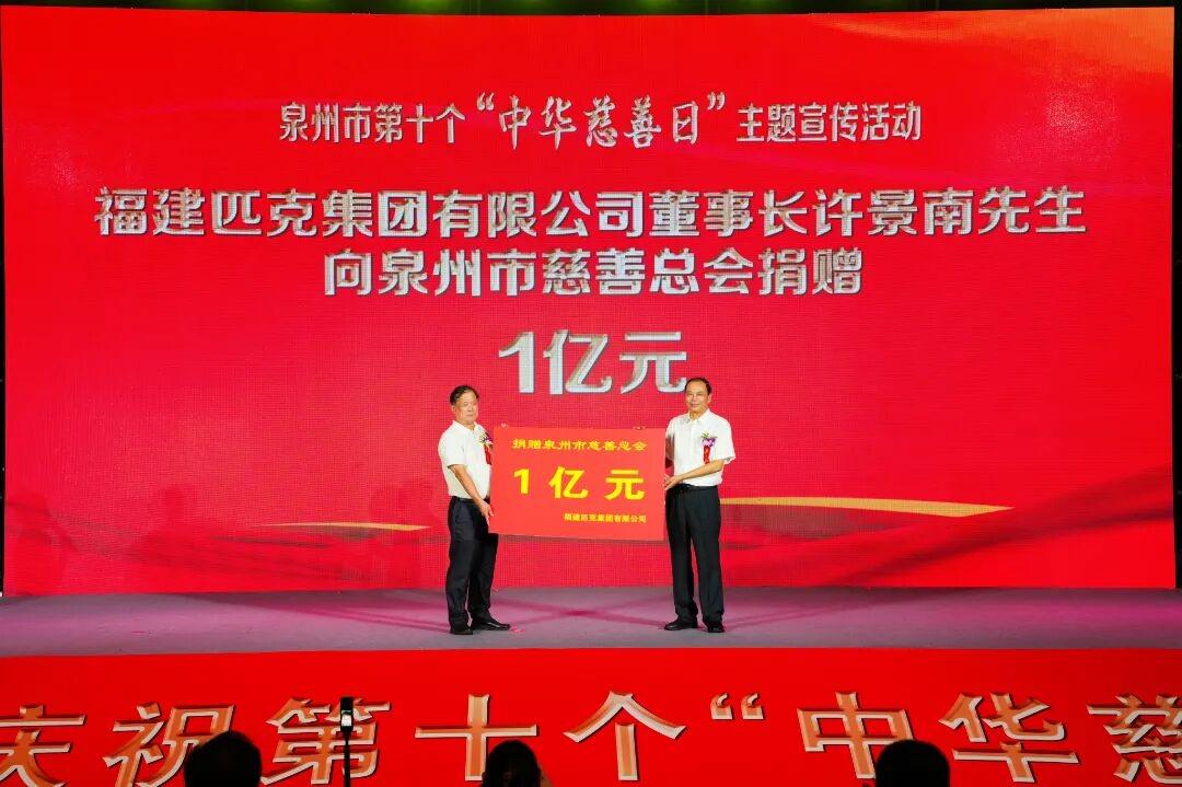 然而,在许景南宣称“今年1-7月亏损1.3亿”的相近时间里,匹克高调向泉州市慈善总会捐了1亿元。许景南站在讲台上举着捐款牌的照片,还被“泉州慈善”官号刊登在新闻中。