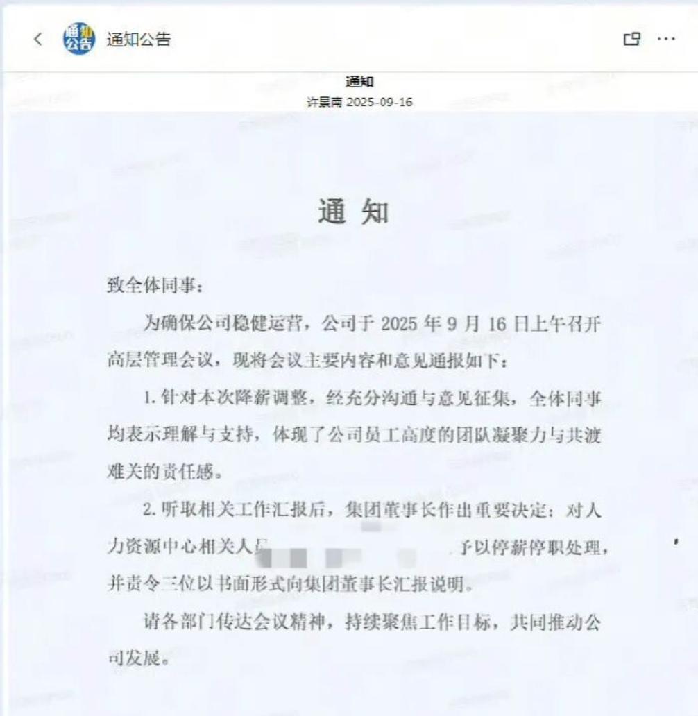 网传匹克公司发送给员工的通知显示:“为保障公司持续运营,鉴于双方前期就薪酬调整事宜未达成一致且由于您不服从公司相关的管理安排,如截止到10月14日仍未就相关事项进行反思、说明并提交检讨,公司将自2025年9月起对薪资暂做停发处理。”