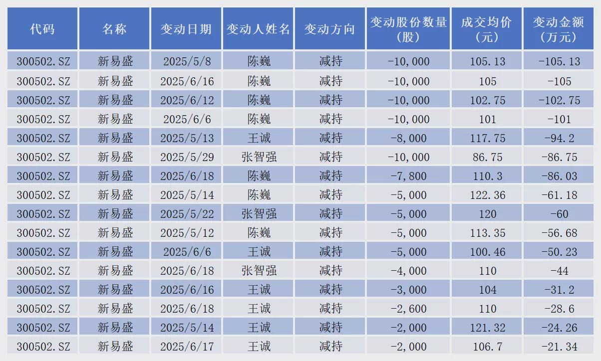 值得关注的是,公司其他高管今年也进行过一次集中减持。今年4月,新易盛公告披露,因个人资金需求,公司副总经理陈巍,副总经理、董事会秘书王诚以及监事张智强计划在三个月内合计减持不超过8.1万股公司股份。减持期届满,陈巍减持金额为617.77万元,王诚减持金额为249.84万元,张智强减持金额为190.74万元。