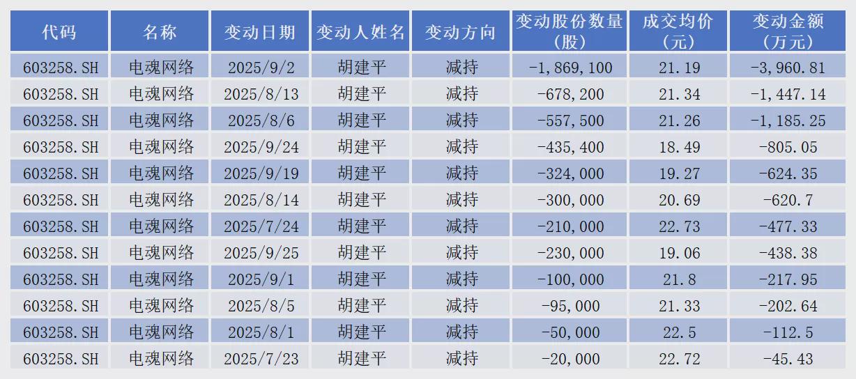 近日,电魂网络(603258.SH)发布公司公告,实际控制人、董事长胡建平已于7月至10月间完成减持486.92万股,套现1.01亿元,减持价格区间18.49-22.73元/股。截至10月10日收盘,电魂网络报20.72元/股,总市值50.56亿元。
