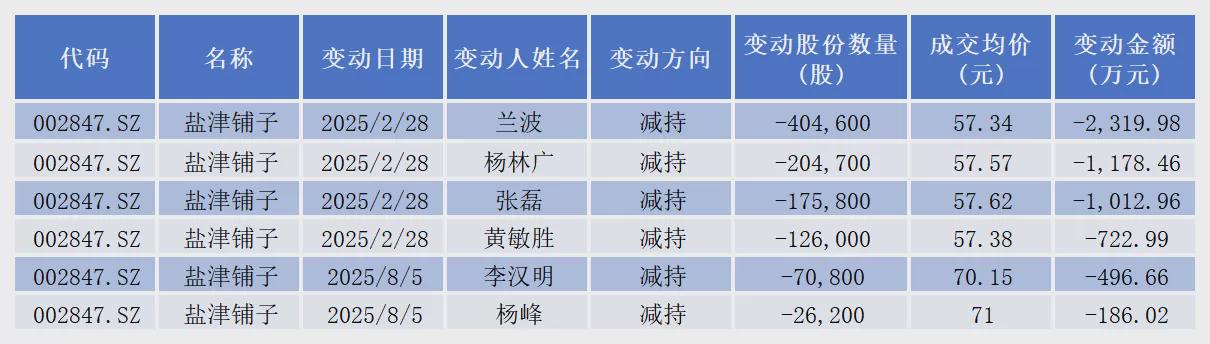 值得关注的是,公司高管层年内已多次“组团”减持,盐津铺子四位副总经理兰波、杨林广、黄敏胜、张磊曾“组团”抛出减持计划,公司副总经理李汉明和财务总监杨峰也加入减持大军。