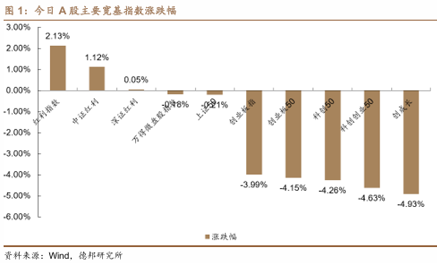 风险偏好下行,避险情绪释放。今日A股市场高开后即开启调整,上证指数收盘报3865.23点,下跌0.62%;深证成指报12895.11点,下跌2.54%;科创50收盘报1410.30点,下跌4.26%;创业板指收盘报2955.98点,下跌3.99%,失守3000点整数关口,收盘价低于昨日最低点。全市场成交额2.60万亿,较前一交易日(2.37万亿)放量9.4%;市场合计1733只股票上涨,3547只股票下跌。