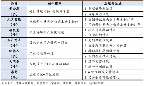 商品方面,我们认为全球计价大宗品方面,金、银价格持续新高,以美元计价的工业品如铜也在跟随上涨,预计有色金属价格仍将是偏强走势;内需品种方面,前期涨幅较大的反内卷工业品开启震荡走势,短期关注点在供给落实,进一步关注点在需求拉动节奏。