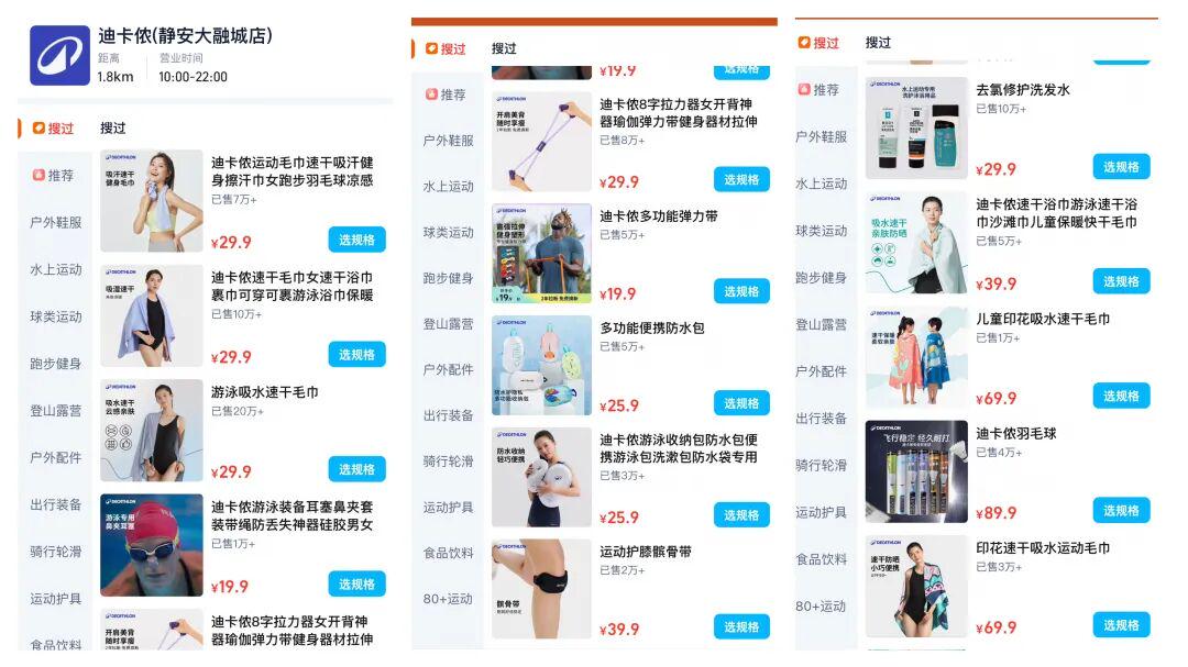 迪卡侬是最早与天猫开展即时零售合作的品牌之一,截至7月,迪卡侬在淘宝闪购的月成交额突破1000万,环比增长超70%。更值得注意的是其增长结构:水上运动品类暴增700%,球迷与健身品类增长超50%,说明即时零售正从基础需求向专业化、兴趣化场景深度渗透。