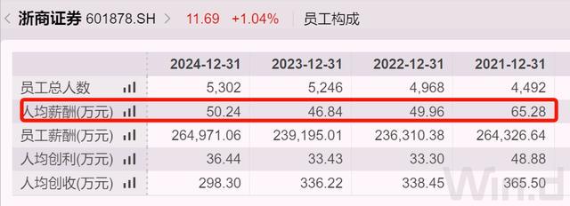 至2024年末,浙商证券职工总数超过5300人,去年人均创利36.4万元,人均税前薪酬超过50万元,比2023年增加大约3.4万元,但和2021年超过65万元相比,减少大约15万元。