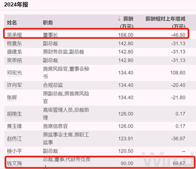 根据公司年报,2024年,吴承根的税前薪酬为168万元,减少46.5万元,依旧排在第一位;钱文海薪酬刚好90万元,在高管中非常靠后。