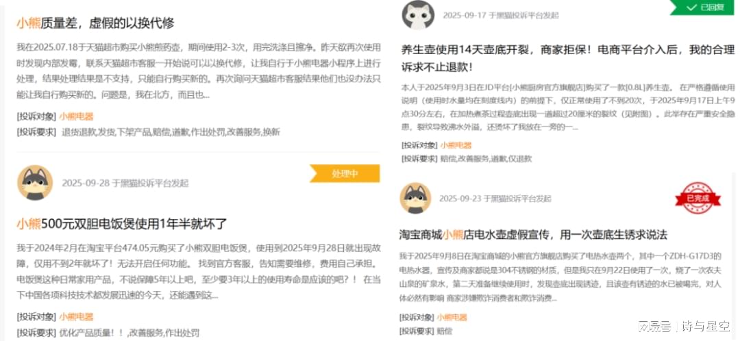 而消费者投诉也不仅限于壶类产品,关于小熊电器其他品类“精准年抛”的吐槽更是层出不穷,包含电饭煲、煮蛋器、豆浆机等,除了产品撑不过一年令人无语之外,使用过程中存在的安全隐患才是真正令人头痛。