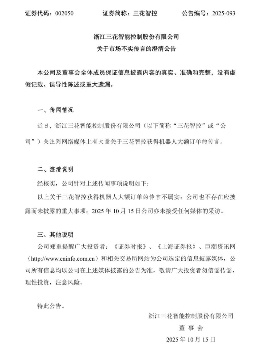 10月15日晚,《辟谣财知道》注意到,三花智控(002050.SZ)公告称,近日关注到网络媒体上有大量关于公司获得机器人大额订单的传言,经核实,该传言不属实;公司也不存在应披露而未披露的重大事项;2025年10月15日公司亦未接受任何媒体的采访。