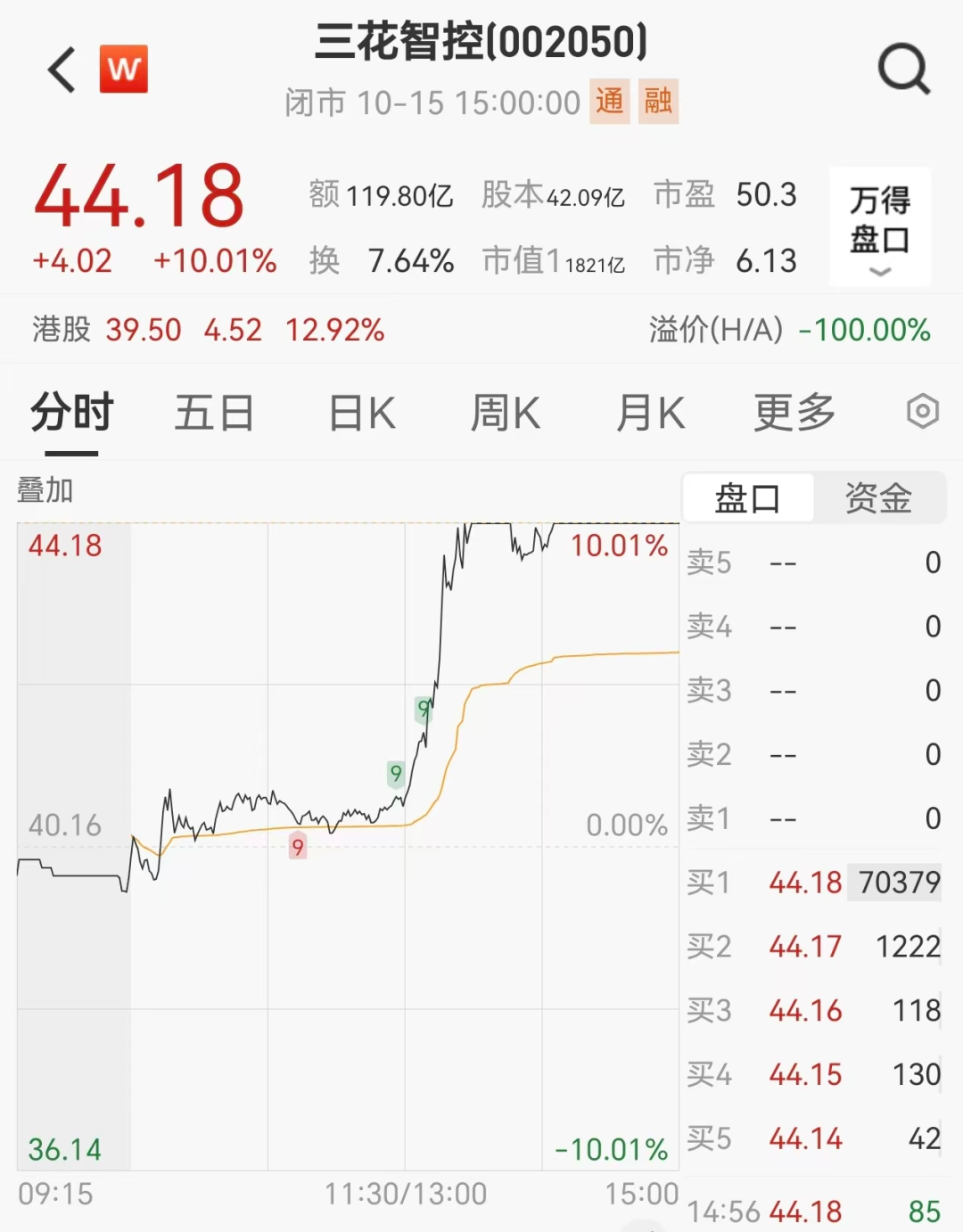 10月15日午后,三花智控(002050.SZ)A股直线拉升涨停,最新市值1821亿元。与此同时,三花智控港股(2050.HK)也同步拉升,盘中一度涨超13%。截至收盘,A股报44.18元/股,涨10.01%,港股报39.5港元/股,涨12.92%。截至10月15日收盘,三花智控本月仍跌8.78%。