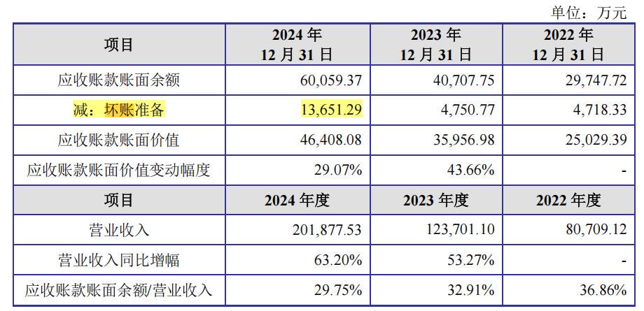 报告期各期末,公司应收账款账面余额分别为2.975亿元、4.071亿元和6.006亿元,占当期营业收入的比重分别为36.86%、32.91%和29.75%。公司应收账款逐年增加,主要是由于报告期内公司收入不断增加所致。公司应收账款余额较大且持续增长,未来若因客户经营状况或信用状况发生不利变化,导致公司应收账款不能按期回收或无法回收,将对公司的经营业绩及现金流等产生不利影响。
