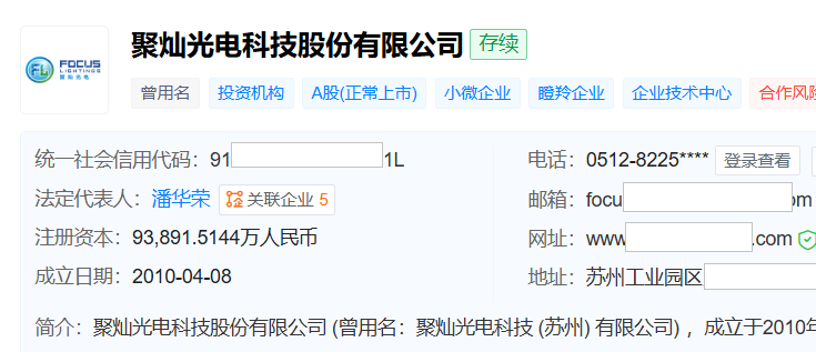 天眼查显示,聚灿光电成立于2010年4月,2017年10月16日在深交所创业板上市,总部位于苏州工业园区。公司主营业务为化合物光电半导体材料的研发、生产和销售,主要产品为LED外延片、芯片。