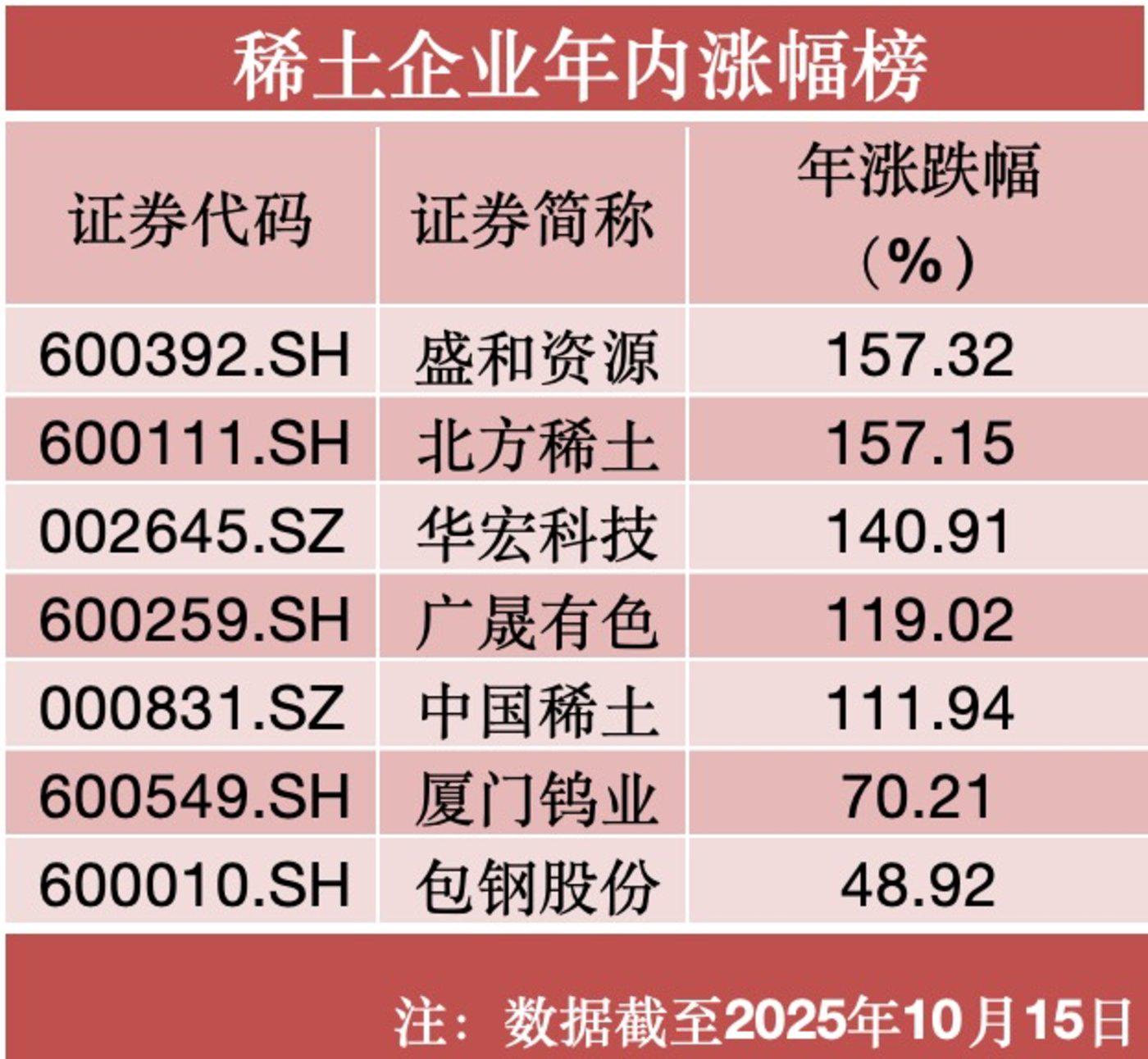 消息一出,已经大涨的稀土板块再次强势向上,10月9日板块大涨7.97%后10月13日再录得9.49%的单日涨幅,个股更是掀起飙涨潮。截至10月15日收盘,北方稀土(600111.SH)、华宏科技(002645.SZ)、广晟有色(600259.SH)等5只年内涨幅都已经超过110%,涨幅最小的包钢股份(600010.SH)涨幅也有48.92%。