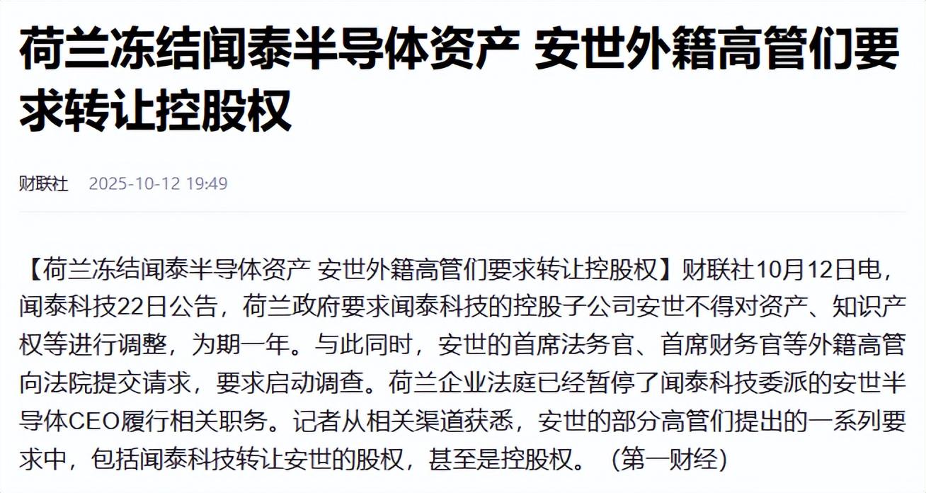 但就在一切向好的时候,荷兰政府突然出手,冻结了闻泰科技持有的股权,暂停了安世半导体中国籍CEO的职务,还任命了一个有最终决定权的临时董事,以后安世半导体的所有事儿,都得他们这名董事说了算,闻泰科技作为全资母公司,竟然连管理都不能参加了。
