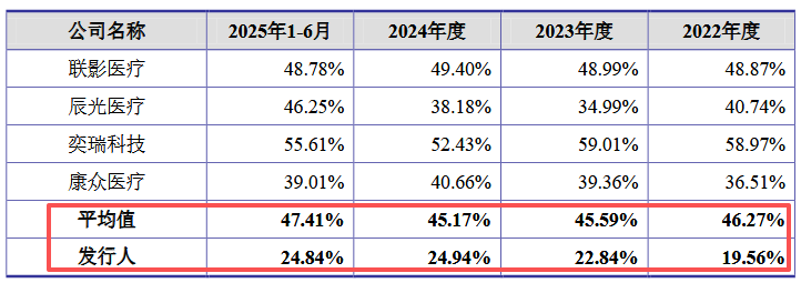 根据公司披露,2022年至2024年以及2025年上半年,健信超导主营业务毛利率分别为19.56%、22.84%、24.94%、24.84%,远低于同行平均值的46.27%、45.59%、45.17%、47.41%,各期分别低了26.71个百分点、22.75个百分点、20.23个百分点、22.57个百分点,逊色不少。