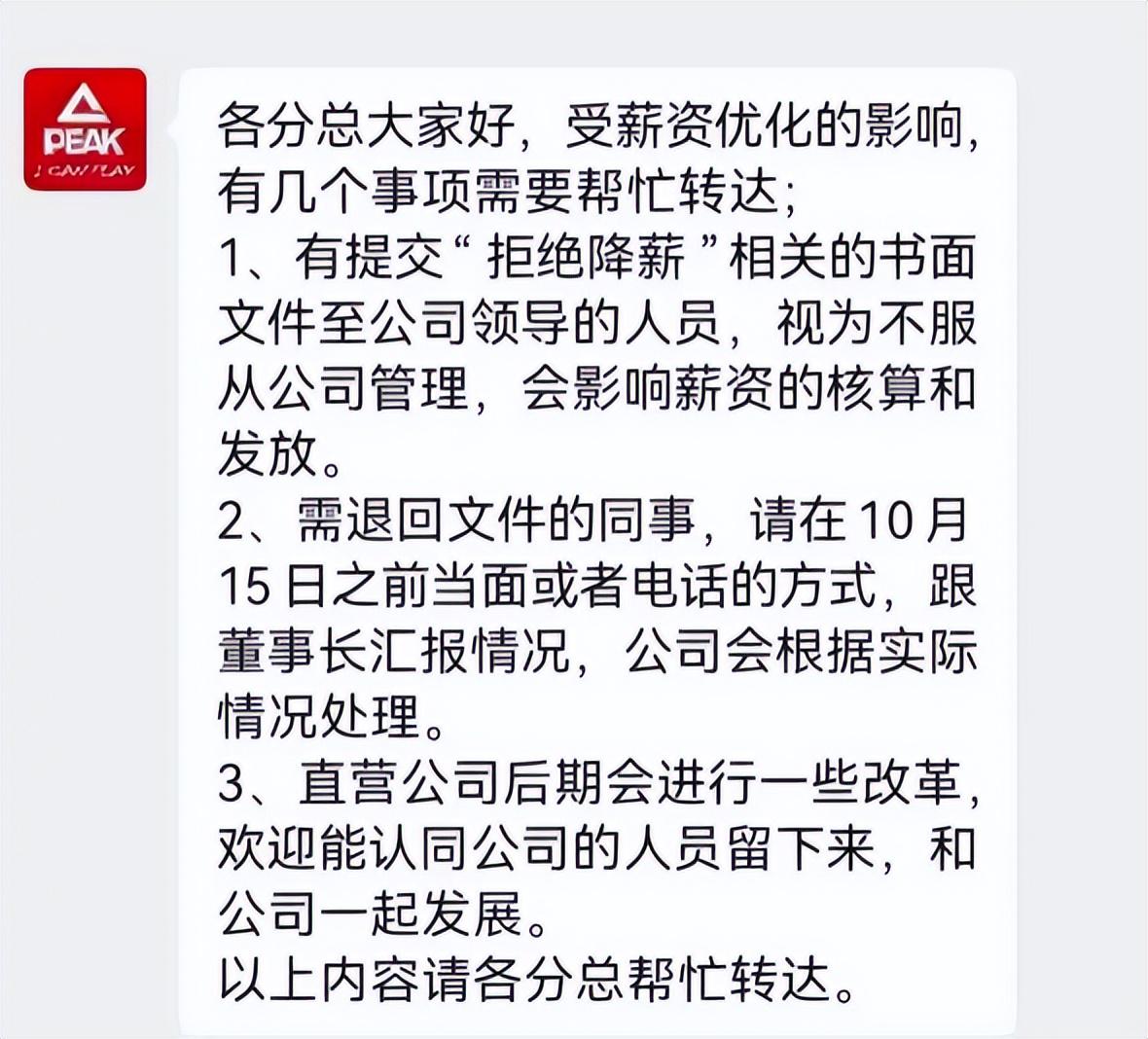 发薪前4天突然口头通知降薪,最高降幅达50%,随后公司宣称“全体同事均表示理解与支持”……9月匹克被员工爆出大面积降薪。